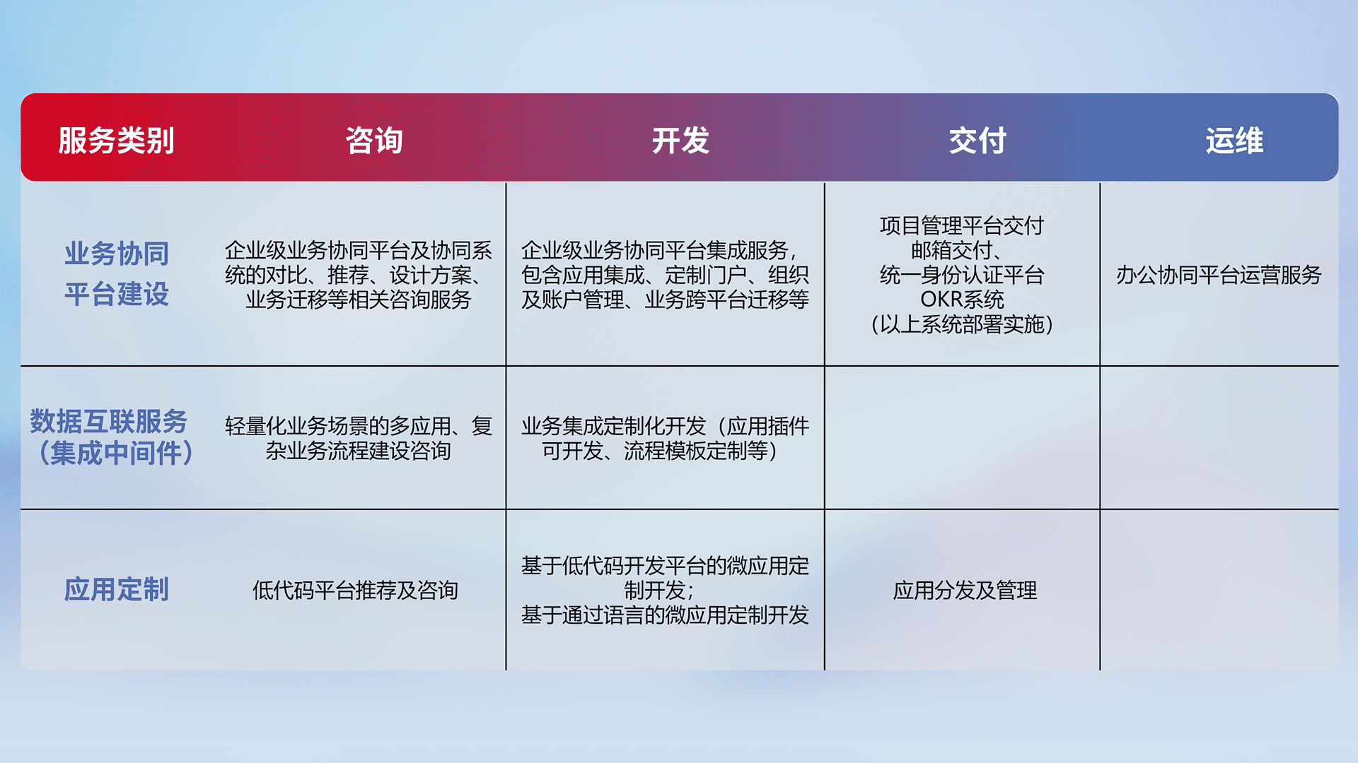 针对钉钉、、企微、、、IDaas等平台级产品提供产品的规划、、方案、、交付、、定制化开发等服务,,,,实现如统一协同办公、、智能客户服务、、、、混合会议管理、、智能数据查询、、、等业务场景,,,,实现数字化转型。。。。